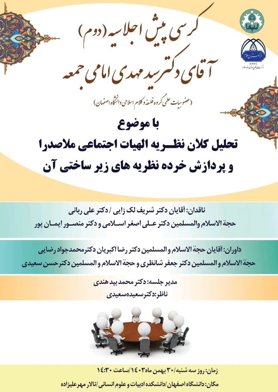 جلسه پیش اجلاسیه نهایی کرسی نظریه پردازی آقای دکتر امامی جمعه تحت عنوان" تحلیل کلان نظریه الهیات اجتماعی ملاصدرا و پردازش خرده نظریه های زیرساختی آن" ساعت ۱۴:۳۰ روز سه شنبه ۳۰ بهمن ماه ۱۴۰۳ در مکان: دانشگاه اصفهان/ دانشکده ادبیات و علوم انسانی/تالار مهرعلیزاده با حضور نقادان و داوران و مدیر و ناظر جلسه و جمعی از اعضای هیات علمی و دانشجویان برگزار شد.